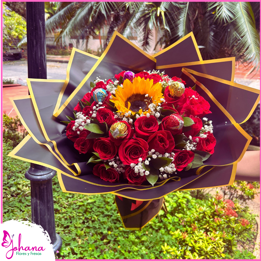 Regala amor y dulzura con un bouquet de rosa roja acompañado de follaje y deliciosos chocolates. Un detalle romántico y encantador, perfecto para cualquier ocasión especial. 5 chocolates, 24 rosas y 1 girasol.