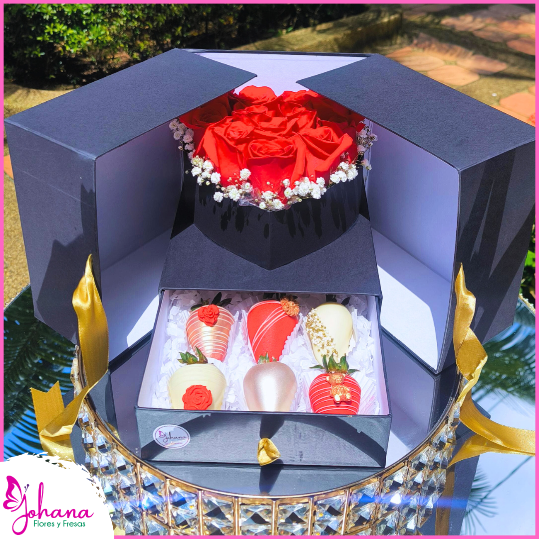 Hermosa caja negra doble puerta y cofre con rosas rojas y 6 fresas cubiertas de chocolate.